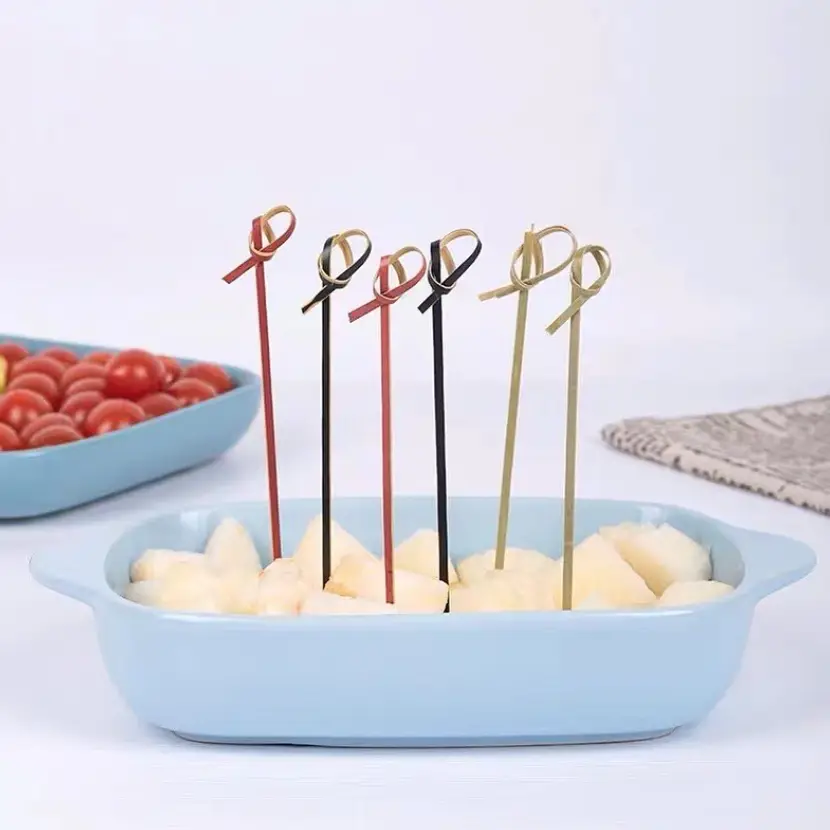Natural bamboo knotted skewers perfect for BBQ, kebabs, fruit, and party food presentation.